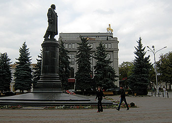 На площади Воссоединения, выложенной бетонными плитами на высоком постаменте, отделанном красно-коричневыми гранитными